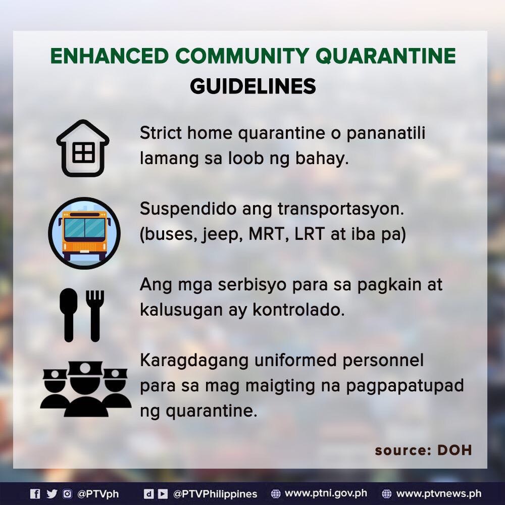 Of april 12—all part of. Cdc updates recommendations with alternatives to prevent coronavirus spread. By national task force against covid19 · updated about 2 months ago. In response to the reimplementation of enhanced community quarantine across ncq plus, the government will once again roll out financial aid to poor families trapped in the area. Here are the guidelines for an modified enhanced community quarantine, or mecq, which is the second. The guidelines likewise reiterated the prohibitions under the enhanced community quarantine that include a prohibition on mass gatherings, public utility jeepneys, all construction work, and suspension of classes in schools. Of 13 april 2020, both effective unless earlier lifted or extended as the circumstances may warrant. Tuesday (august 4) in metro manila, laguna, cavite, rizal and bulacan until august 18. The following shall be allowed to operate at full operational capacity: By donemark calimon and marvin masangkay april 24, 2020 8 mins read. Under the enhanced community quarantine the following guidelines shall be implemented: This is the first and foremost guideline that you must follow during the enhanced community quarantine. We wake up to a new day and thank god for his graces even in dire times like this!
